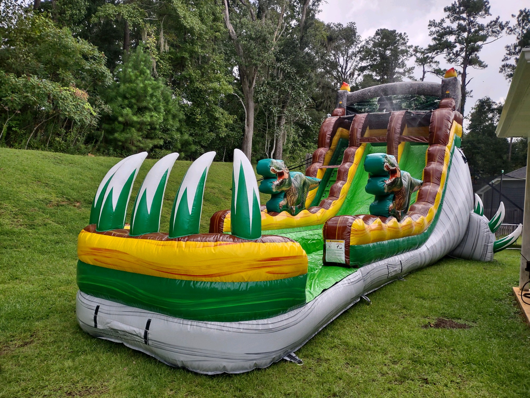 Kids will climb up the ramp between these friendly dinos and race down two exciting slide lanes—perfect for side-by-side fun with friends or siblings. At the bottom, a cushioned inflatable wall ensures a safe and gentle stop after every thrilling ride.
