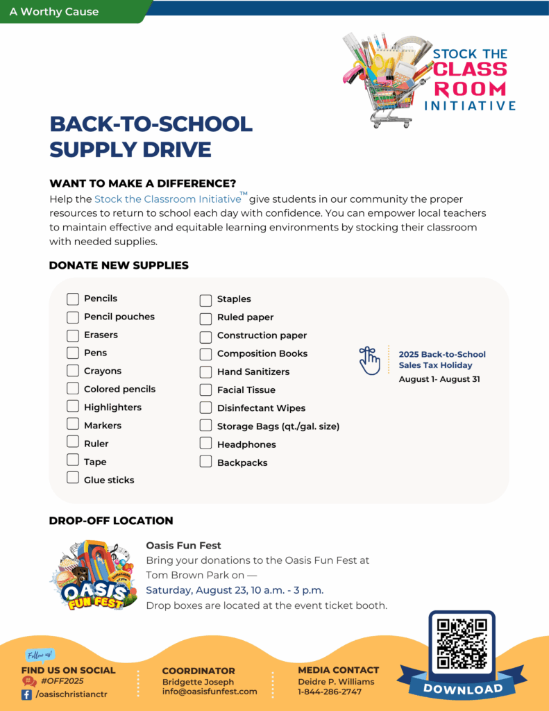 Every child deserves the tools to learn, dream, and succeed—but many classrooms in Leon County face the challenge of limited resources. That’s why Oasis Christian Center launched Stock the Classroom—a heartfelt initiative to equip underfunded elementary schools with the supplies they need most.